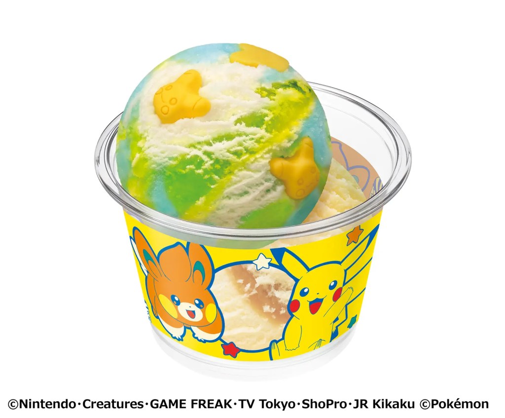 今年の新作ポケモンフレーバーは、夏の定番・ソーダフロートをイメージしたこちら!お子様から大人までみんな大好きなソーダやラムネをイメージした夏にぴったりの爽やかなソーダ風味ソルベに、ソーダの上に乗ったアイスをイメージしたバニラアイスクリームを合わせました!