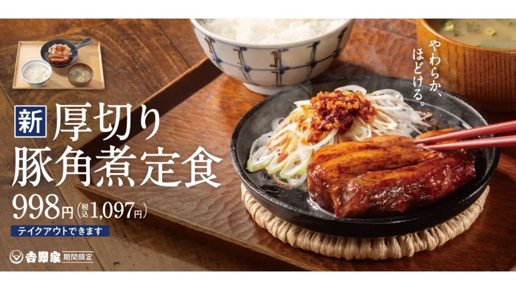 株式会社吉野家は、全国の吉野家店舗※にて、2025年7月31日(木)11時より、期間限定で「厚切り豚角煮定食」の販売を開始しました。「厚切り豚角煮定食」はテイクアウトの利用も可能です。