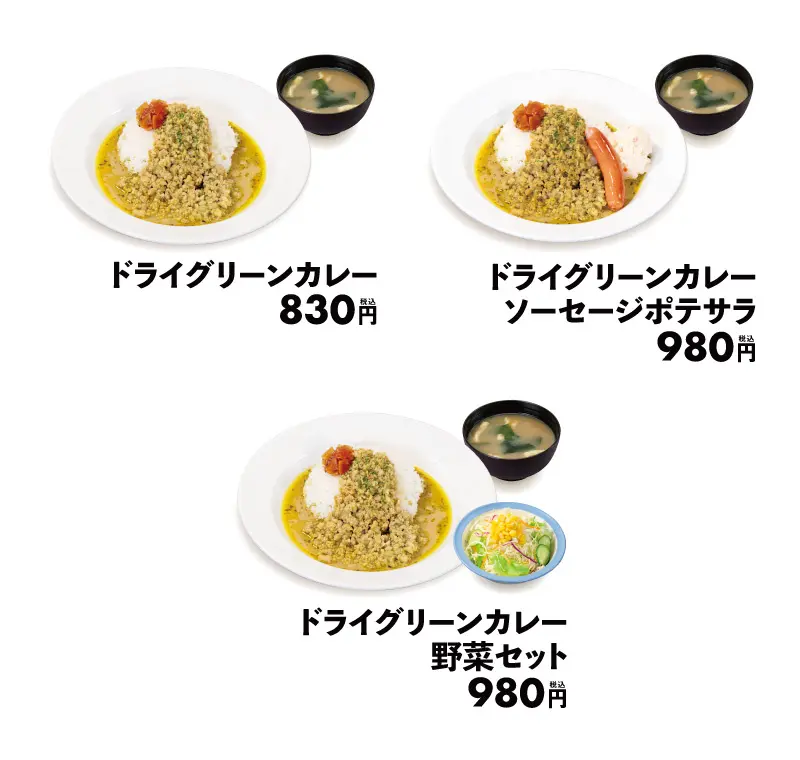 「野菜セット」や「ソーセージポテサラ」も販売してます。異なる食感と風味が一度に味わえる松屋の「ドライグリーンカレー」を、ぜひご賞味ください。