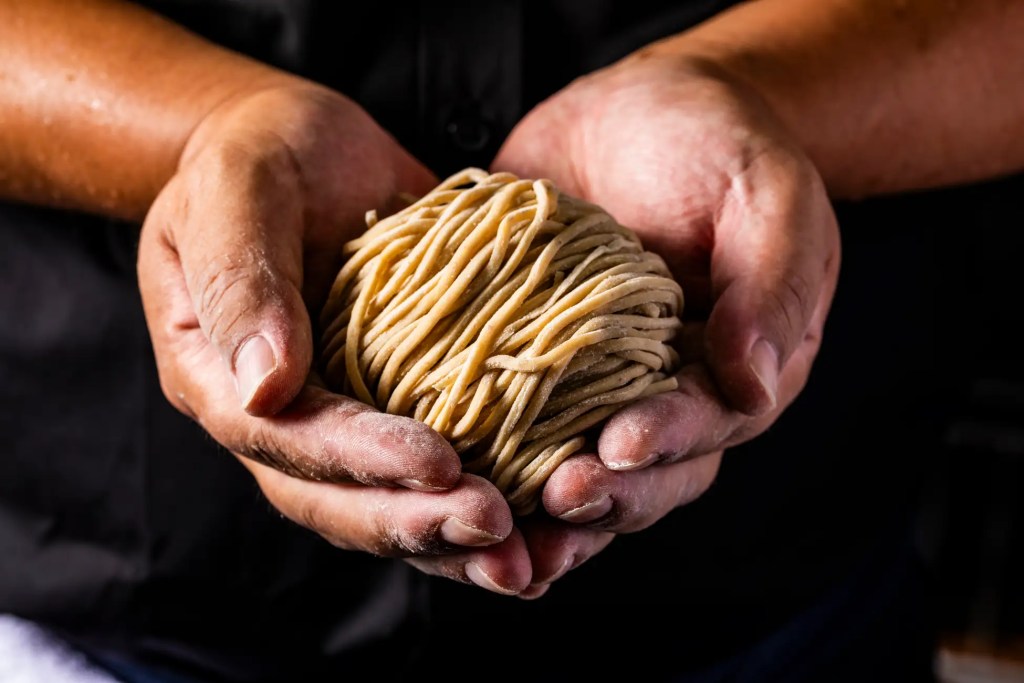 北海道産「春よ恋」と三重県産「あやひかり」を使用した国産小麦100%の特注麺が、甘えびの旨味たっぷりのスープを存分にまといます。加水率を極限まで高め、もちもちとした食感と国産小麦の香りが、甘えびの風味を一層引き立てます。