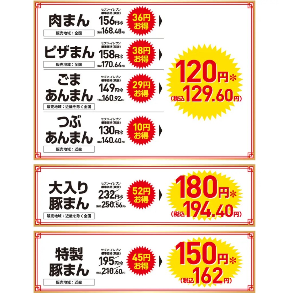 「ふんわり×ごろっと 肉まん」、「もちふわ×とろ~り ピザまん」、「ふわふわ×とろっと 濃厚ごまあんまん」、「もちふわ×つぶつぶ つぶあんまん」(※1)は全品各120円(税込129.60円)、「もちもち×ずっしり 大入り豚まん」は180円(税込194.40円)、「もっちり×ジューシー 特製豚まん」(※2)は150円(税込162.00円)で販売します。