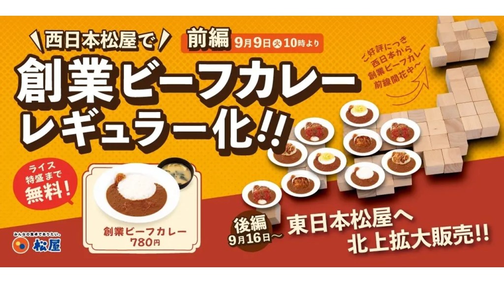 牛めし・カレー・定食・その他丼の「松屋」では、2025年9月9日(火)10時より西日本店舗、2025年9月16日(火)10時より東日本店舗にて、「創業ビーフカレー」を順次販売します。