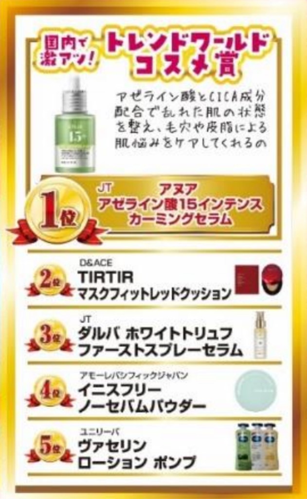 ドン・キホーテで販売された韓国をはじめとする海外ブランド商品の中から、国内のお客さまに多く購入いただいた商品。1位は上半期累計販売点数8.5万点以上を記録した韓国コスメ「anua アゼライン酸 15インテンスカーミングセラム」。アゼライン酸と CICA 成分を配合し、肌の状態を整え、毛穴や皮脂による肌悩みをケアする商品です。1~4位まで韓国ブランドが君臨し、韓国コスメブームの定番化が見られました。