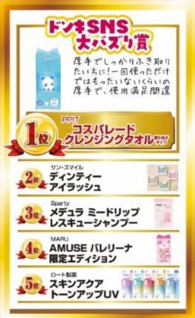 ドン・キホーテ公式 SNS でバズった商品を選出。1位は TikTok 動画視聴数45.7万回以上を突破した「cosparade クレンジングタオル」。厚手で天然パルプ100%を使用し、1枚ずつ取り出せる利便性も人気の理由となりました。