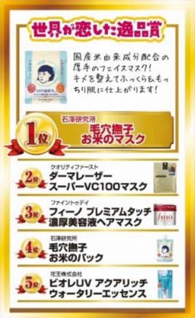 海外のお客さまから多く購入いただいた商品。1位は「石澤研究所 毛穴撫子 お米のマスク」で、100%国産米由来成分のライスセラムが配合されていて、国籍問わず支持を集めました。上半期累計販売点数44.8万点以上を記録しました。