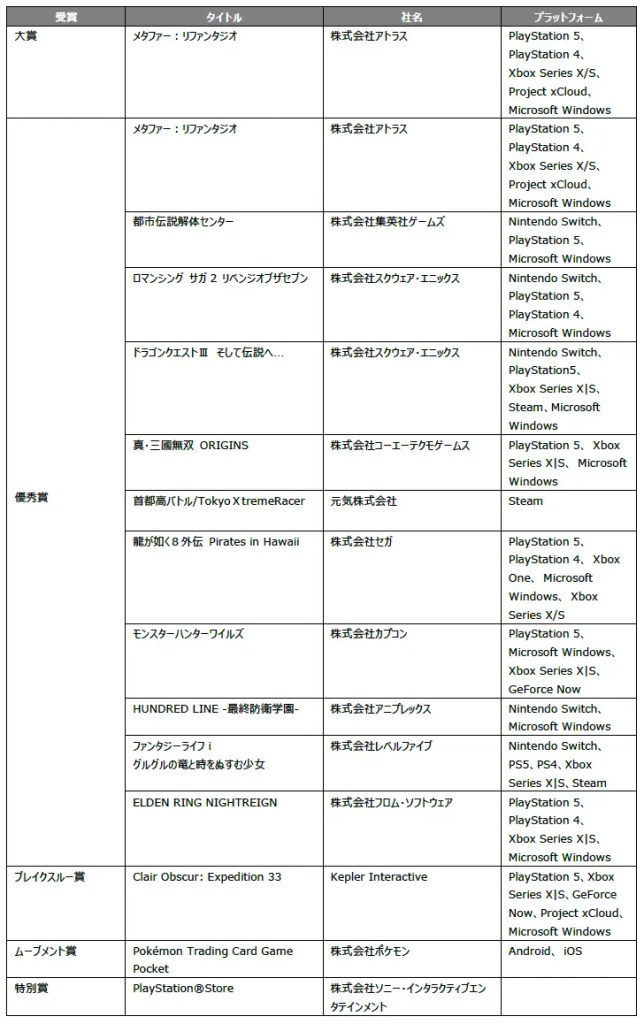 今回で開催29回⽬を迎える「⽇本ゲーム⼤賞 2025」の年間作品部⾨の⼤賞を「メタファー:リファンタジオ」(株式会社アトラス)が受賞しました。また、ブレイクスルー賞は、「ClairObscur: Expedition 33」(Kepler Interactive)、ムーブメント賞は、「Pokémon Trading Card Game Pocket」(株式会社ポケモン)がそれぞれ受賞しました。このほか、対象期間中に話題になった作品、計11作品※が優秀賞を受賞しました。