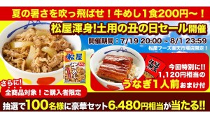 松屋フーズ楽天市場店を利用すると抽選で「牛めしの具」「ふわっトロッうなぎ」各4食セットが当たる土用の丑の日セール開催